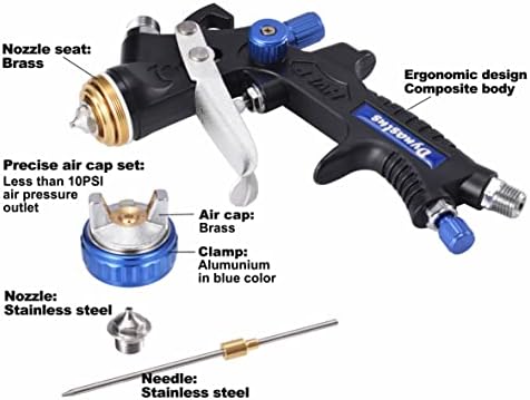 The Dynastus Pro Series spray gun is the lowest weight gun available and provide the premium performance with all types automotive, industrial, and woodworking coatings. Adjustable to achieve round and flat spray patterns. HVLP spray gun gets a superior finish while saving paint. Precision machined air caps and fluid nozzles deliver a reliability and perfect paint atomization. All internal passages are anodized and the body is a mirror polished oxidized surface, allows for easier cleanup. This spray gun is supplied with a 20 oz. (600 cc) metal paint cup, with 1.4 mm nozzle. This paint gun sprays anywhere from 30 – 43 PSI, a good general pressure to start spraying at is 40 PSI.