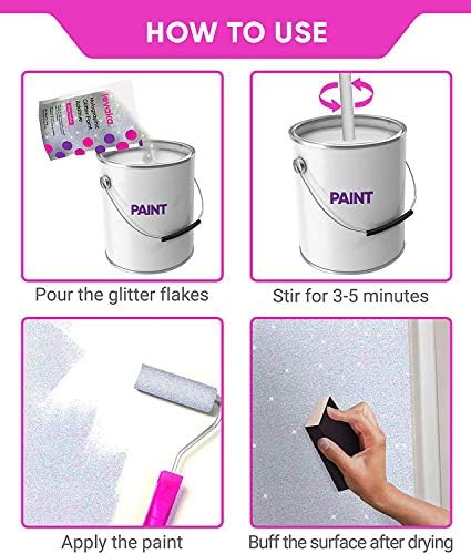 Anyone can do it! – Your walls will be sparkling in no time! Simply open a pouch of the Levaka paint glitter additive for walls and add it to 0.5 gallons of paint. Stir for approximately 5 minutes and begin painting. Mix to your preferred ratio, but adding additional glitter will make your walls sparkle even more! It is strongly recommended to paint a small sample beforehand to see the effects for yourself and proceed accordingly. Ideal for Soft Sheen, Dead Flat, Matte, or Silk Emulsion Paint.